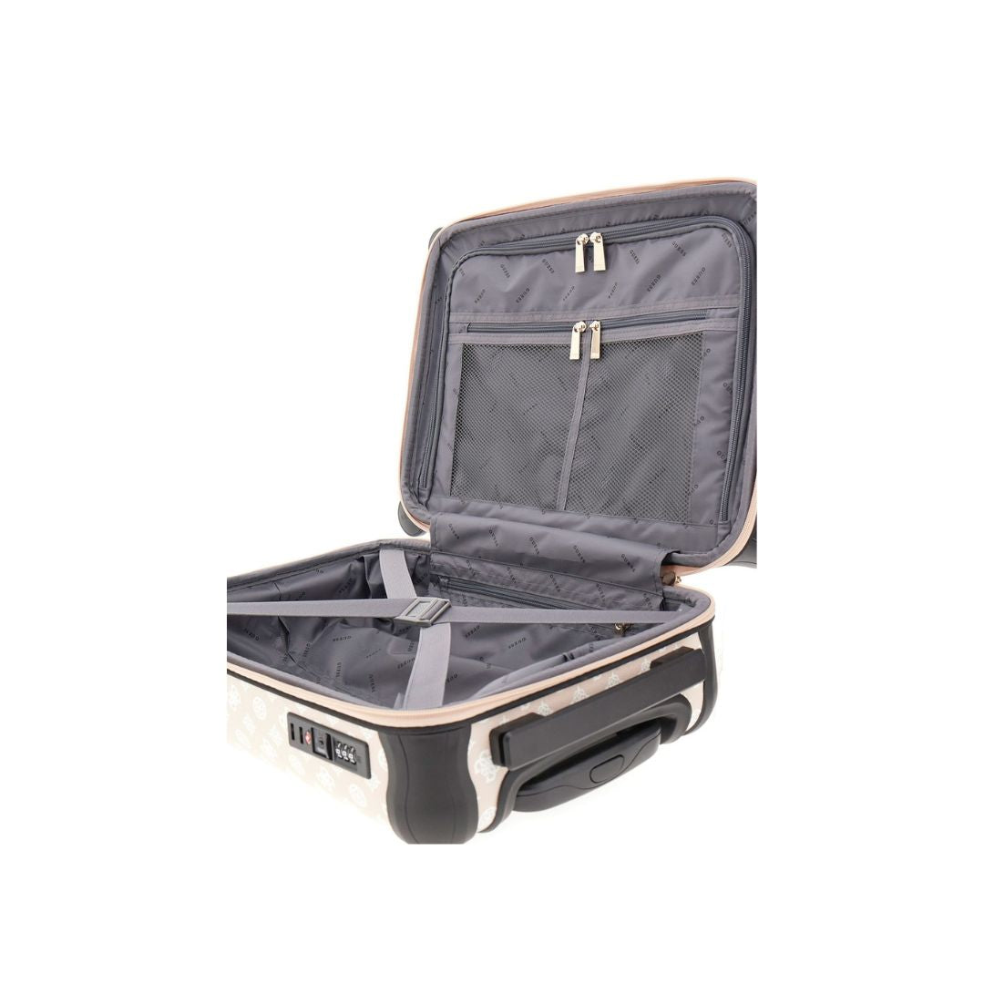 Guess WILDER 18 INCH cabin bag in beige and white. Lightweight, durable carry-on with practical compartments and a sleek design that fits overhead bins. Perfect for weekend trips and everyday travel.
